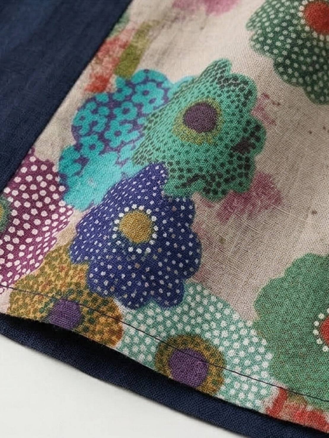 - Large patch pocket on lower left in printed fabric