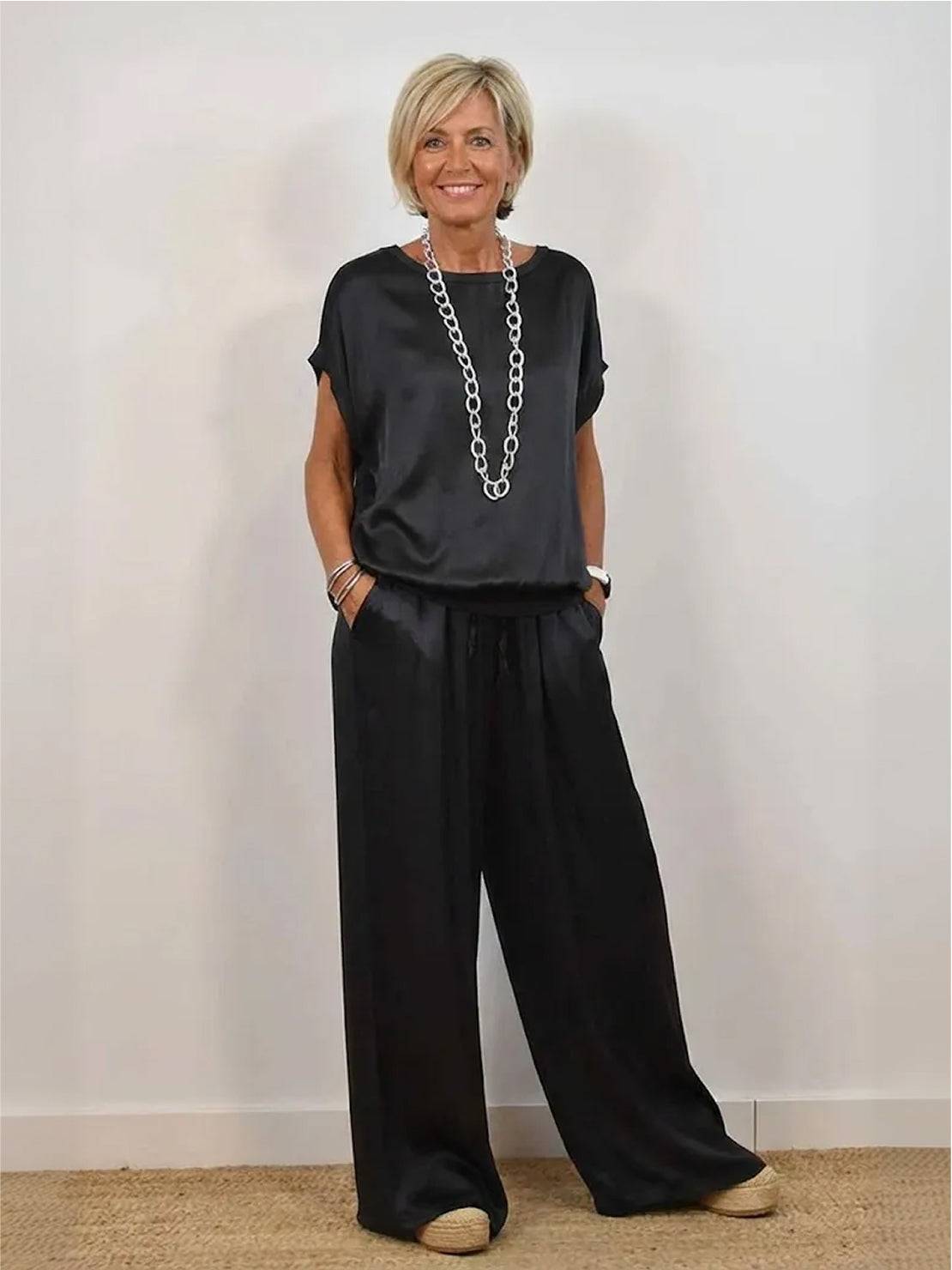 • It flatters your shape - The top slims your upper body, and those wide-leg pants give you room to breathe while looking absolutely elegant.